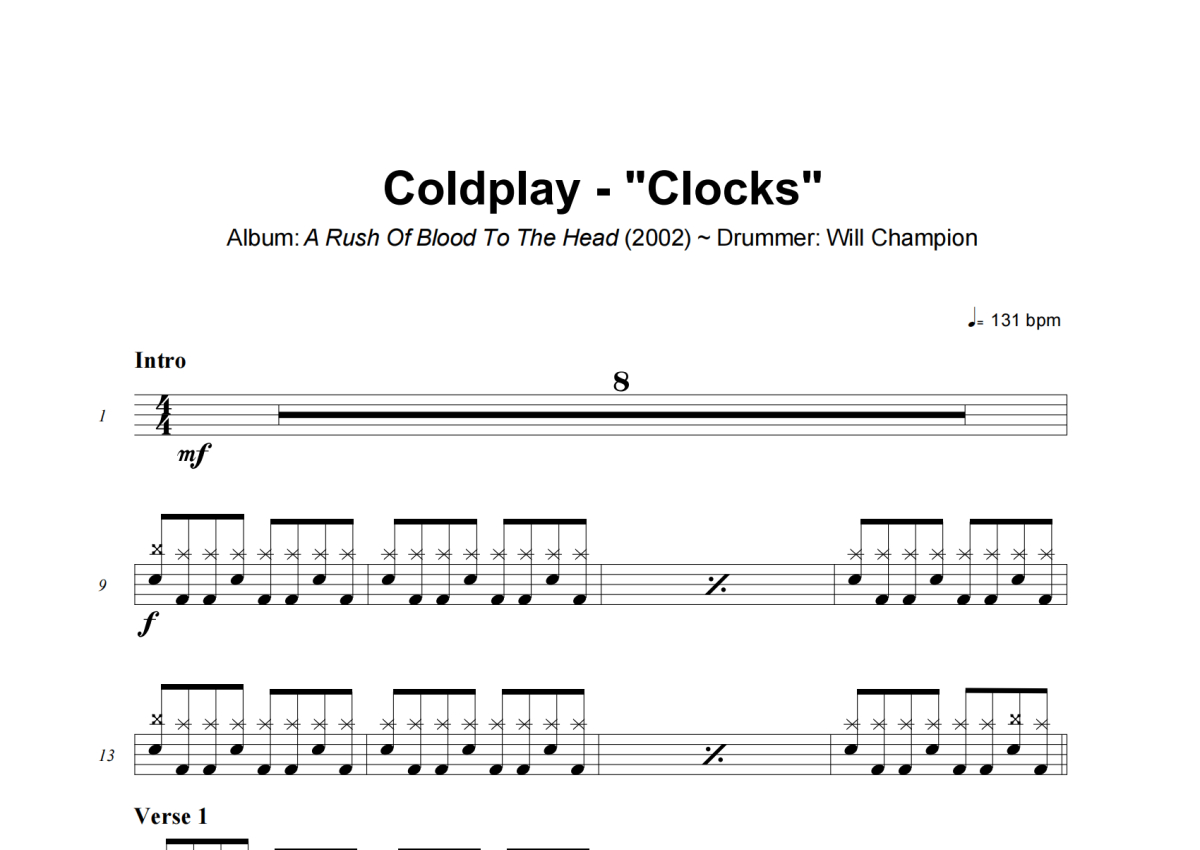 《Clocks》是Coldplay演唱的一首歌曲,拍号为4/4拍,这份架子鼓谱共有三张高清图谱,图谱由 @小虎鼓谱 编配上传,图谱使用五线谱编配,使用这份Clocks架子鼓谱,你将能够轻松地敲打出这首Coldplay的Clocks,快来尝试吧。