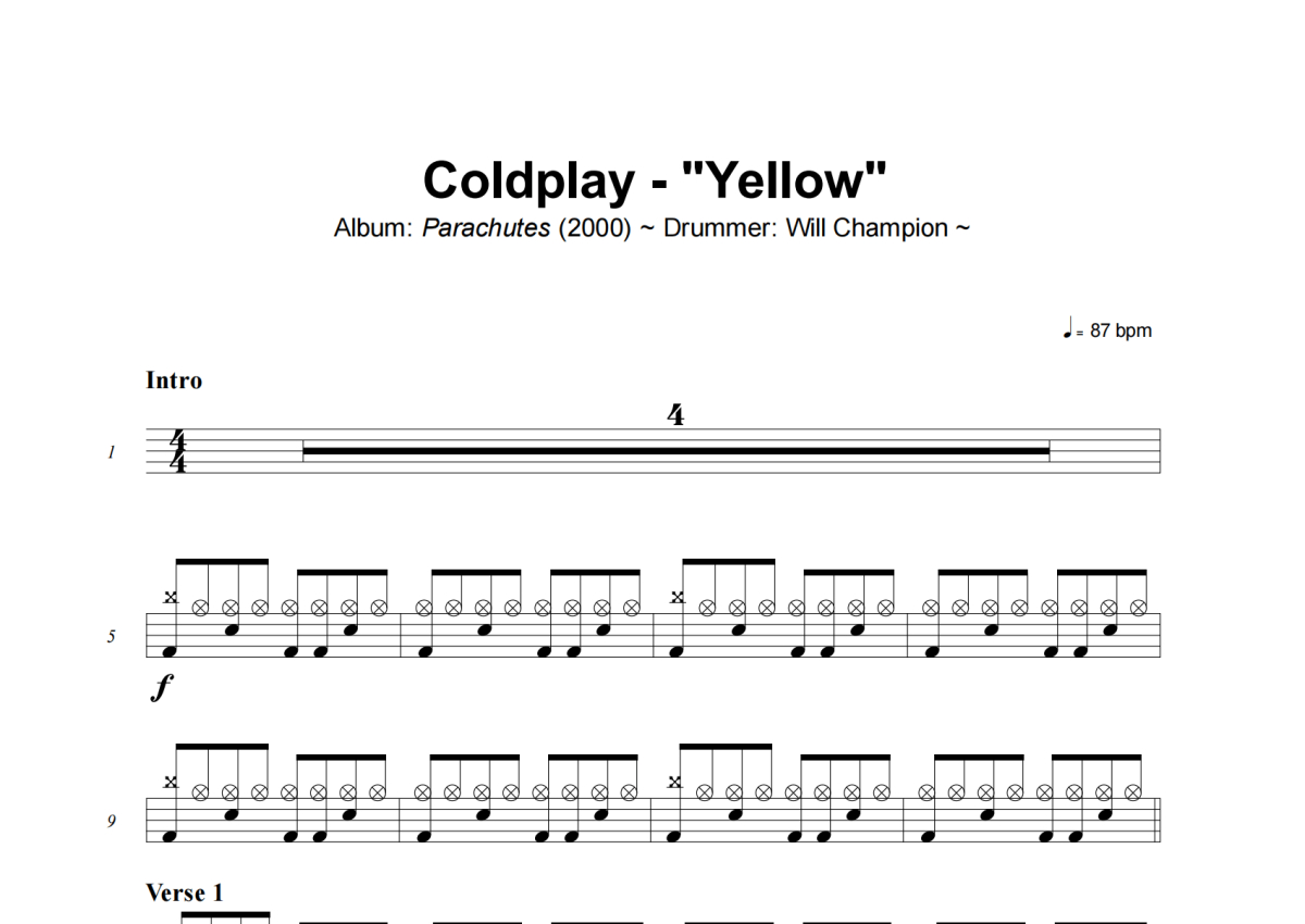 《Yellow》是Coldplay演唱的一首歌曲,这份架子鼓谱共有三张高清图谱,图谱由 @小虎鼓谱 编配上传,图谱使用五线谱编配,使用这份Yellow架子鼓谱,你将能够轻松地敲打出这首Coldplay的Yellow,快来尝试吧。
