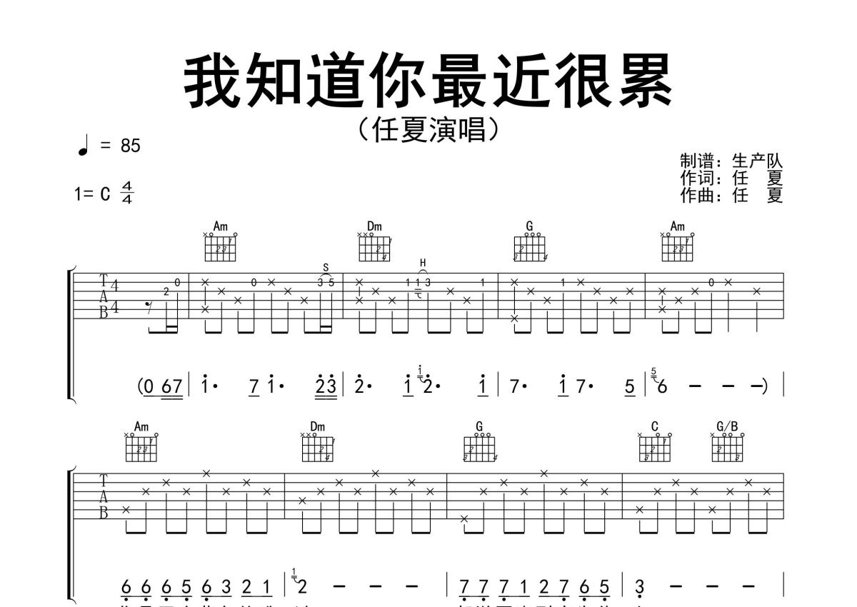 《我知道你最近很累》是任夏演唱的一首歌曲,精编完美版,拍号为4/4拍,歌曲速度为每分钟85拍,歌曲原调为C调,本吉他谱采用的是C调指法编配,演奏时不需要使用变调夹即为原调,这份吉他谱共有三张高清图谱,图谱由 @生产队 编配上传,图谱使用六线谱编配,包含吉他和弦指法、简谱以及歌词部分,使用这份我知道你最近很累吉他谱,可以让你更加方便地掌握这首歌曲的弹唱技巧,快来尝试吧。任夏作词、作曲并演唱的歌曲《我知道你最近很累》原版吉他谱,完整的前奏、间奏、尾奏solo编配。