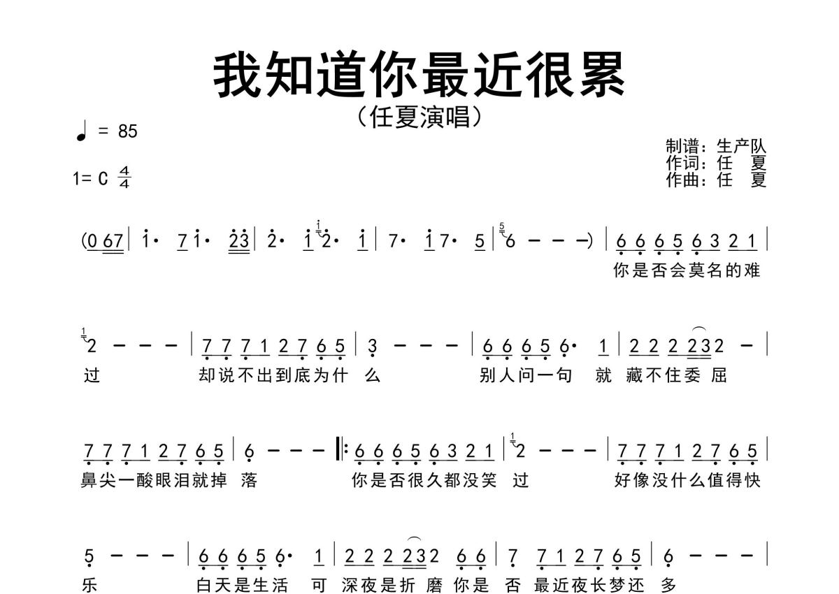 《我知道你最近很累》是任夏演唱的一首歌曲,原版简谱,拍号为4/4拍,歌曲速度为每分钟85拍,这份简谱共有一张高清图谱,图谱由 @生产队 编配上传任夏作词、作曲并演唱的歌曲《我知道你最近很累》原版简谱,完整的前奏、间奏、尾奏solo编配。