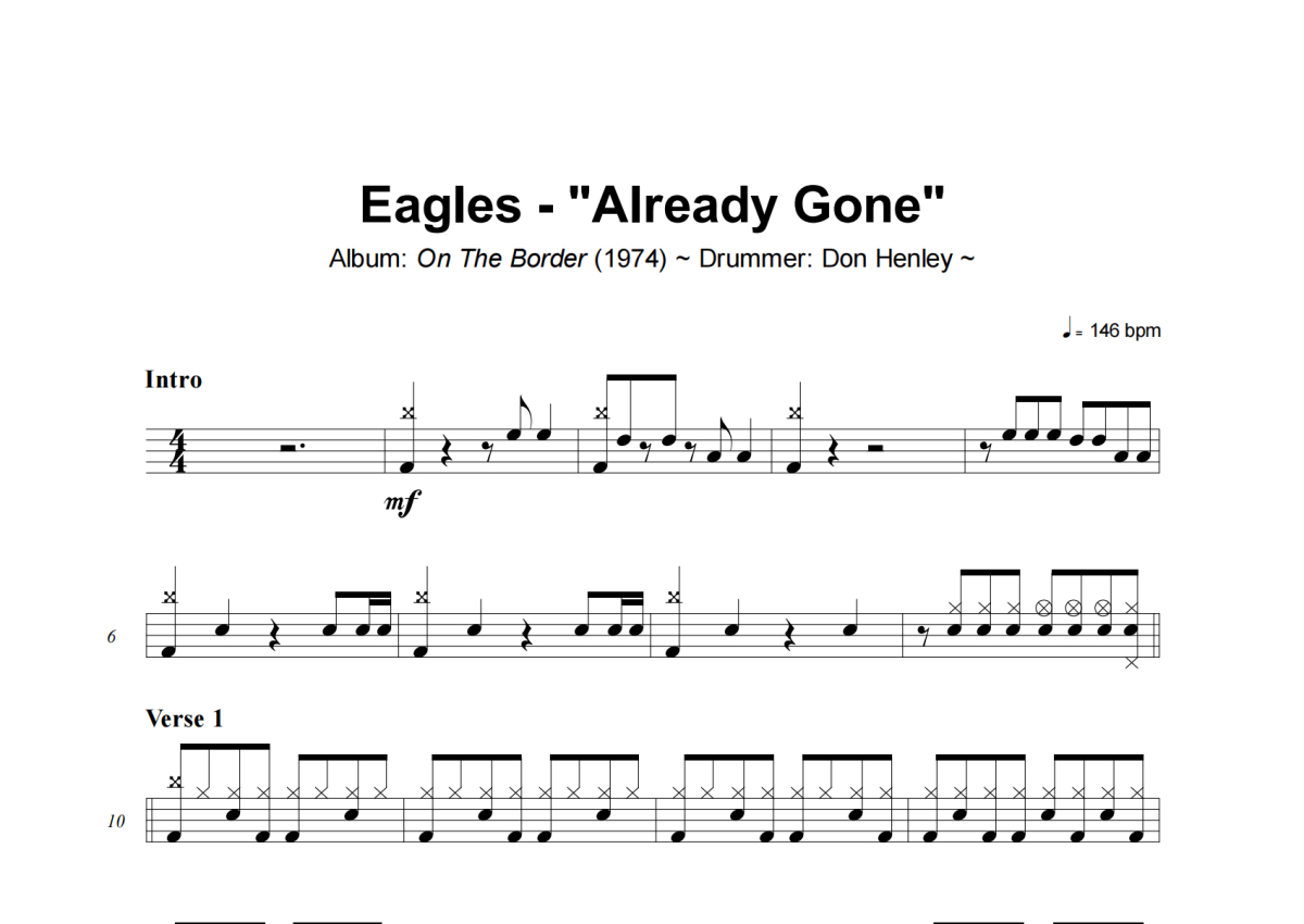 《Already Gone》是Eagles演唱的一首歌曲,拍号为4/4拍,这份架子鼓谱共有五张高清图谱,图谱由 @小虎鼓谱 编配上传,图谱使用五线谱编配,使用这份Already Gone架子鼓谱,你将能够轻松地敲打出这首Eagles的Already Gone,快来尝试吧。