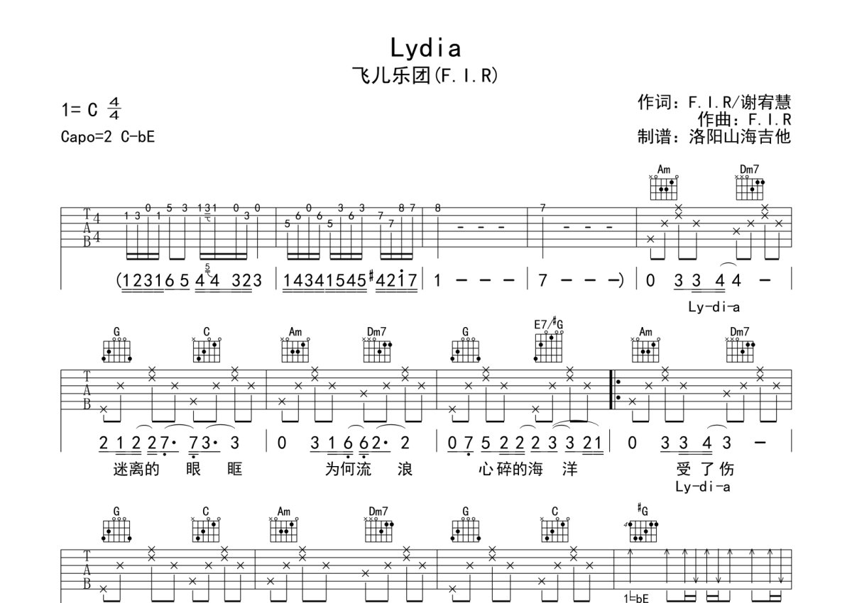 飞儿乐团《Lydia》吉他谱 - C调弹唱六线谱
