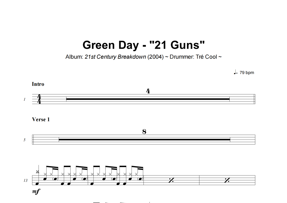《21 Guns》是Green Day演唱的一首歌曲,拍号为4/4拍,这份架子鼓谱共有三张高清图谱,图谱由 @小虎鼓谱 编配上传,图谱使用五线谱编配,使用这份21 Guns架子鼓谱,你将能够轻松地敲打出这首Green Day的21 Guns,快来尝试吧。