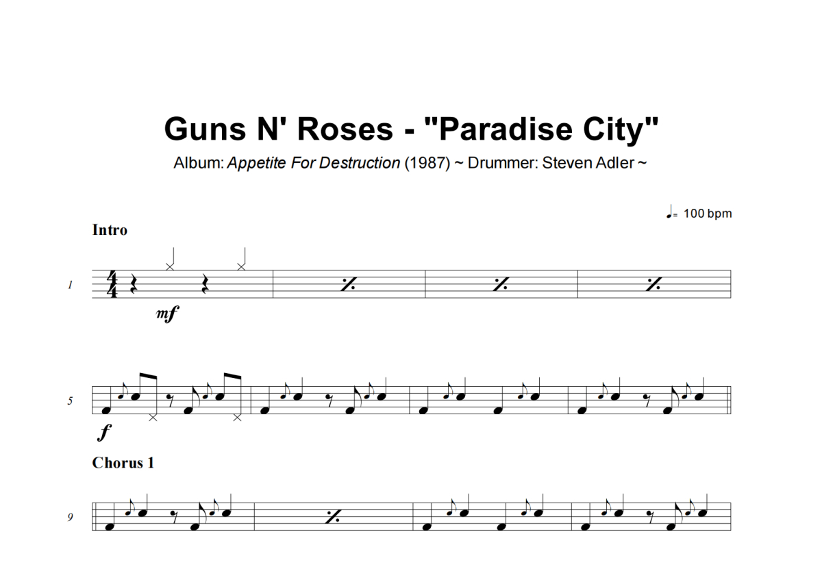 《Paradise City》是Guns N_Roses演唱的一首歌曲,拍号为4/4拍,这份架子鼓谱共有五张高清图谱,图谱由 @小虎鼓谱 编配上传,图谱使用五线谱编配,使用这份Paradise City架子鼓谱,你将能够轻松地敲打出这首Guns N_Roses的Paradise City,快来尝试吧。