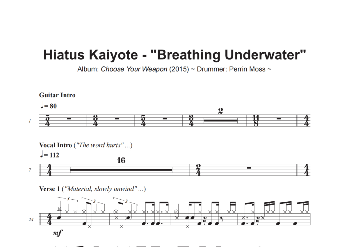 《Breathing Underwater》是Hiatus Kaiyote演唱的一首歌曲,这份架子鼓谱共有五张高清图谱,图谱由 @小虎鼓谱 编配上传,图谱使用五线谱编配,使用这份Breathing Underwater架子鼓谱,你将能够轻松地敲打出这首Hiatus Kaiyote的Breathing Underwater,快来尝试吧。