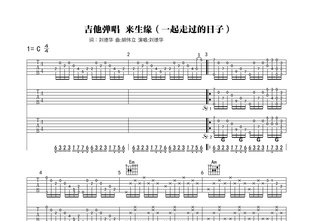 刘德华《一起走过的日子》吉他谱 - C调弹唱六线谱