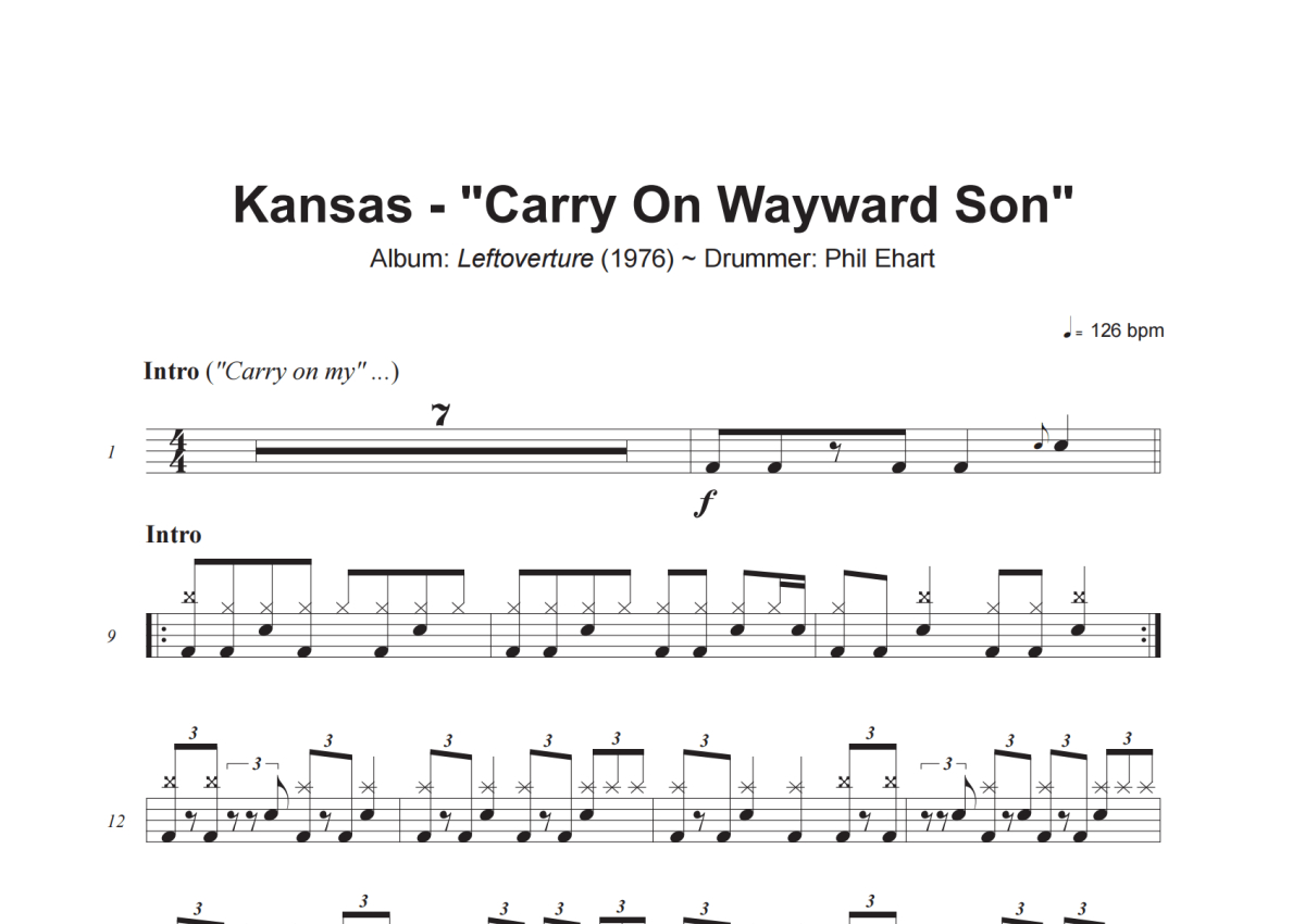 《Carry On Wayward Son》是Kansas演唱的一首歌曲,拍号为4/4拍,这份架子鼓谱共有五张高清图谱,图谱由 @小虎鼓谱 编配上传,图谱使用五线谱编配,使用这份Carry On Wayward Son架子鼓谱,你将能够轻松地敲打出这首Kansas的Carry On Wayward Son,快来尝试吧。