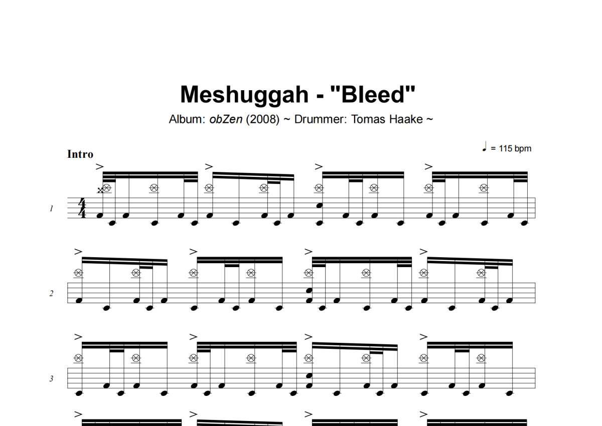 《Bleed》是Meshuggah演唱的一首歌曲,这份架子鼓谱共有21张高清图谱,图谱由 @小虎鼓谱 编配上传,图谱使用五线谱编配,使用这份Bleed架子鼓谱,你将能够轻松地敲打出这首Meshuggah的Bleed,快来尝试吧。