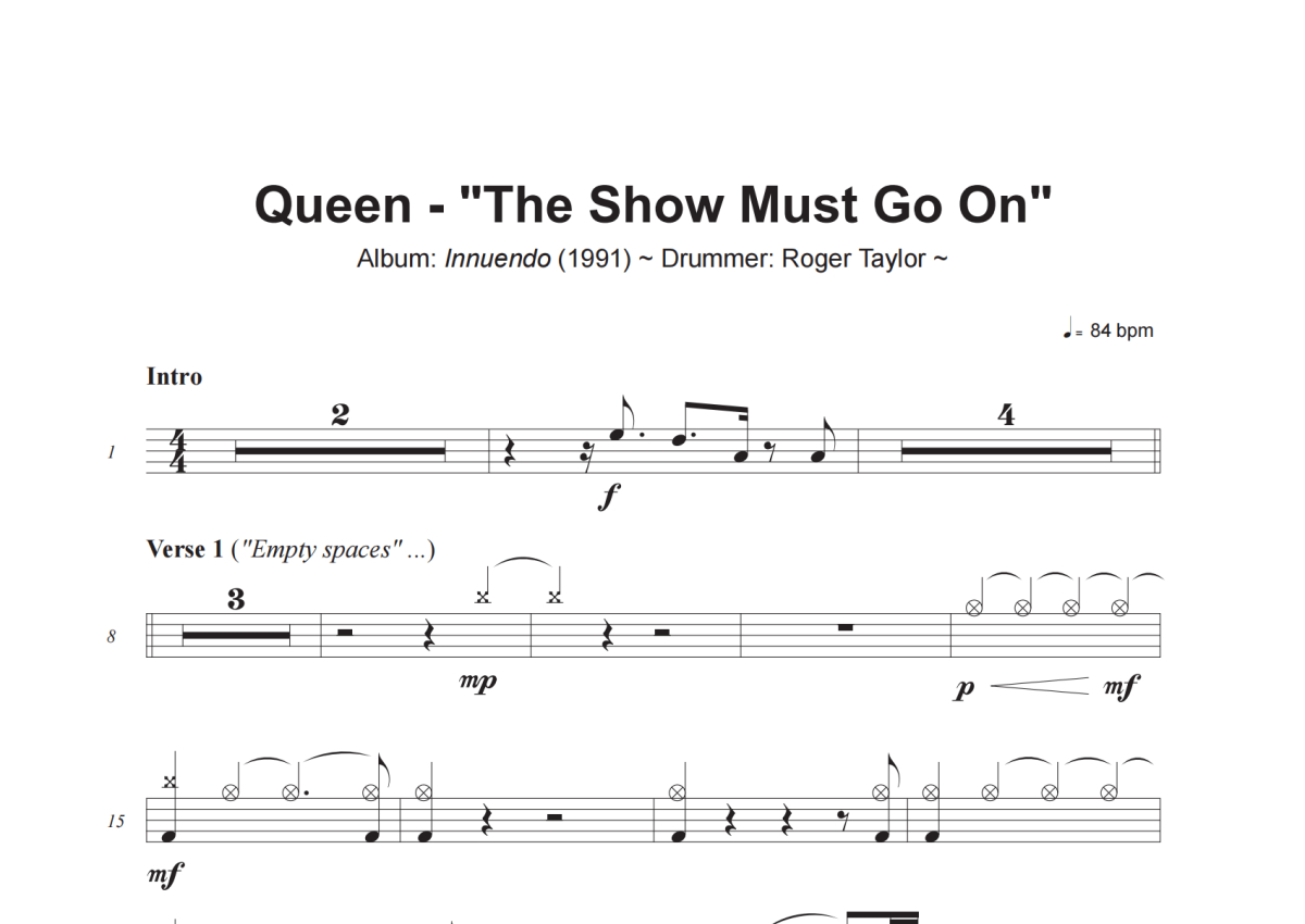 《The Show Must Go On》是Queen演唱的一首歌曲,这份架子鼓谱共有三张高清图谱,图谱由 @小虎鼓谱 编配上传,图谱使用五线谱编配,使用这份The Show Must Go On架子鼓谱,你将能够轻松地敲打出这首Queen的The Show Must Go On,快来尝试吧。