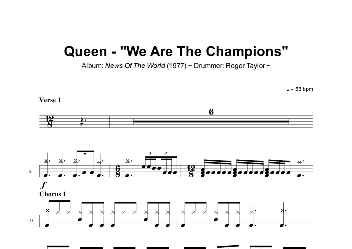 《We Are The Champions》是Queen演唱的一首歌曲,这份架子鼓谱共有三张高清图谱,图谱由 @小虎鼓谱 编配上传,图谱使用五线谱编配,使用这份We Are The Champions架子鼓谱,你将能够轻松地敲打出这首Queen的We Are The Champions,快来尝试吧。