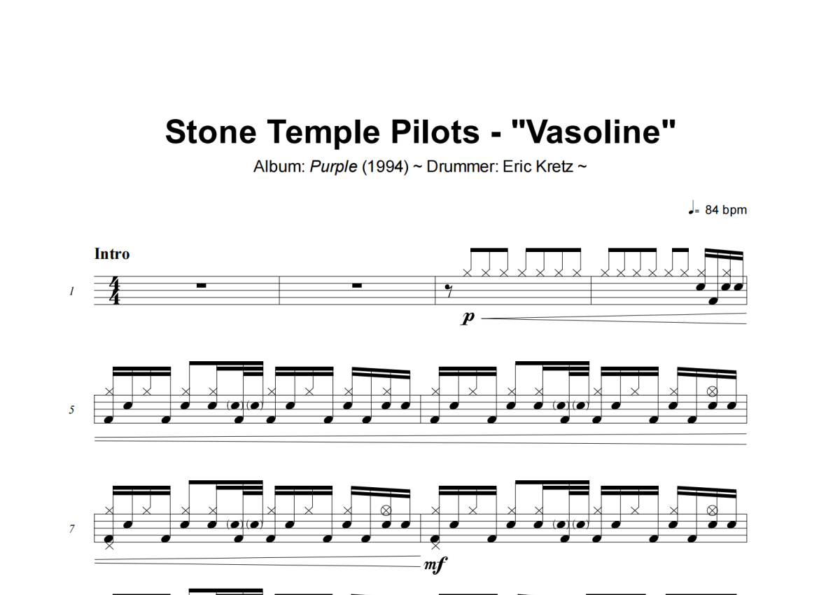《Vasoline》是Stone Temple Pilots演唱的一首歌曲,这份架子鼓谱共有四张高清图谱,图谱由 @小虎鼓谱 编配上传,图谱使用五线谱编配,使用这份Vasoline架子鼓谱,你将能够轻松地敲打出这首Stone Temple Pilots的Vasoline,快来尝试吧。