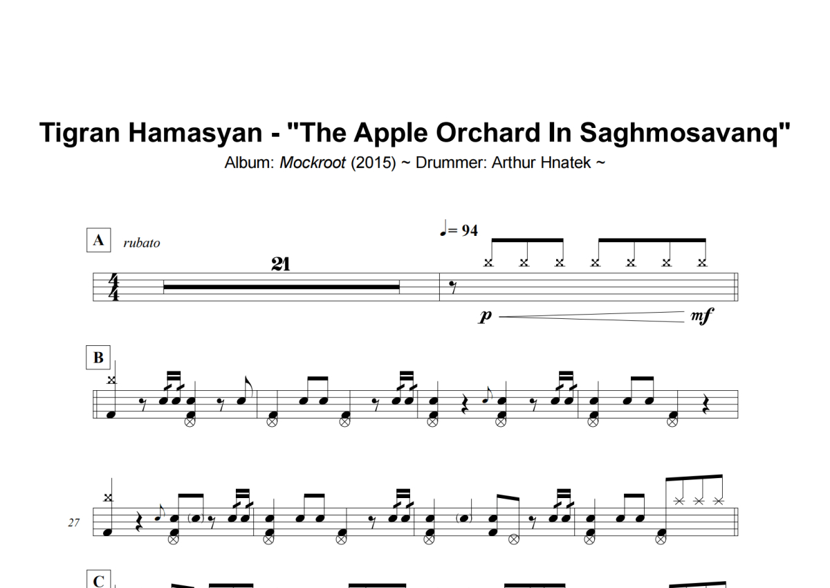 Tigran Hamasyan《The Apple Orchard in Saghmosavanq》架子鼓谱