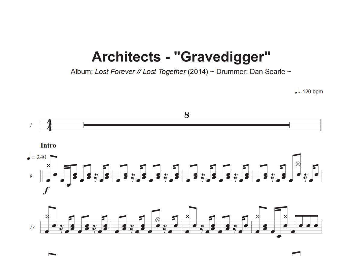 《Gravedigger》是Architects演唱的一首歌曲,这份架子鼓谱共有六张高清图谱,图谱由 @小虎鼓谱 编配上传,图谱使用五线谱编配,使用这份Gravedigger架子鼓谱,你将能够轻松地敲打出这首Architects的Gravedigger,快来尝试吧。