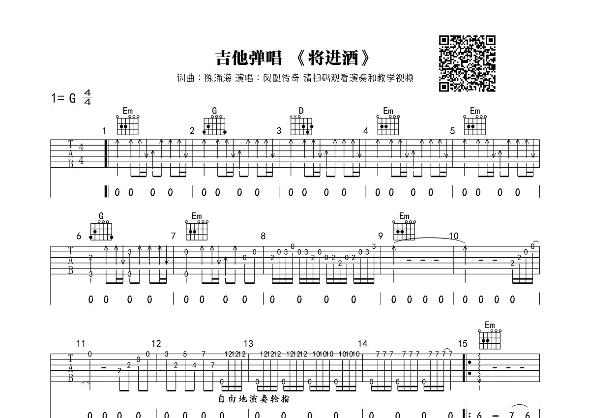 凤凰传奇《将进酒》吉他谱 - G调弹唱六线谱