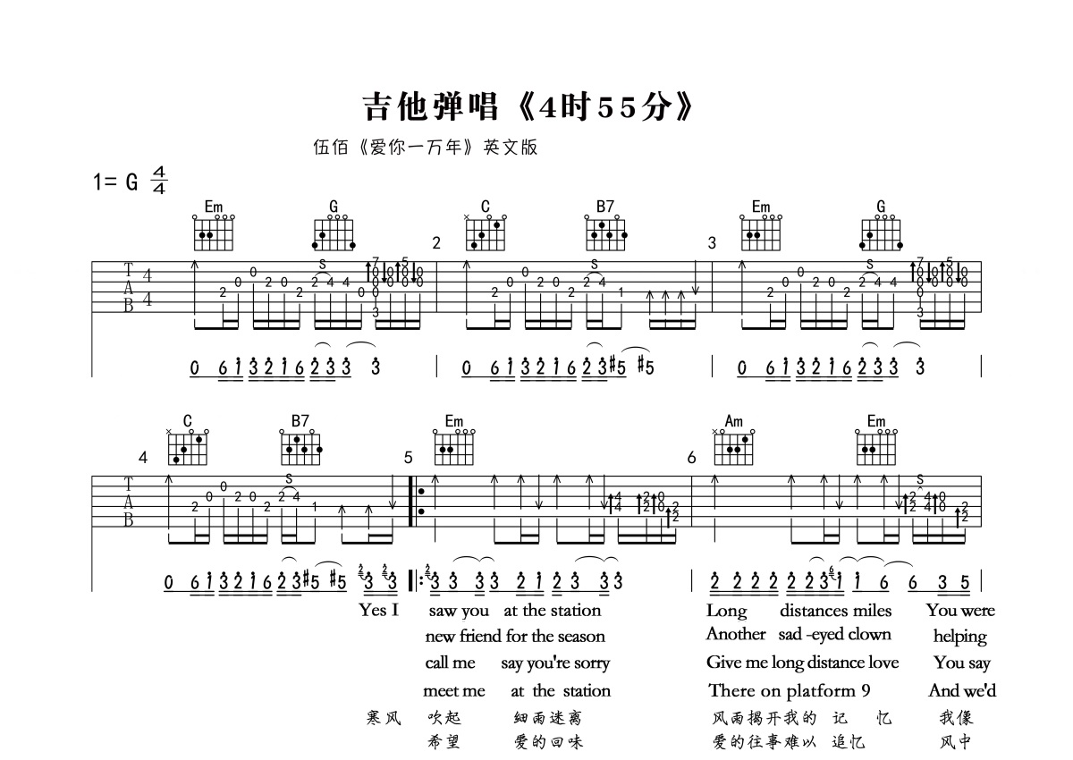 《爱你一万年》是伍佰演唱的一首歌曲,本吉他谱采用的是G调指法编配,这份吉他谱共有两张高清图谱,图谱由 @深蓝雨吉他 编配上传,图谱使用六线谱编配,包含吉他和弦指法、简谱以及歌词部分,使用这份爱你一万年吉他谱,可以让你更加方便地掌握这首歌曲的弹唱技巧,快来尝试吧。伍佰《爱你一万年》英文版《4式55分》吉他弹唱谱。