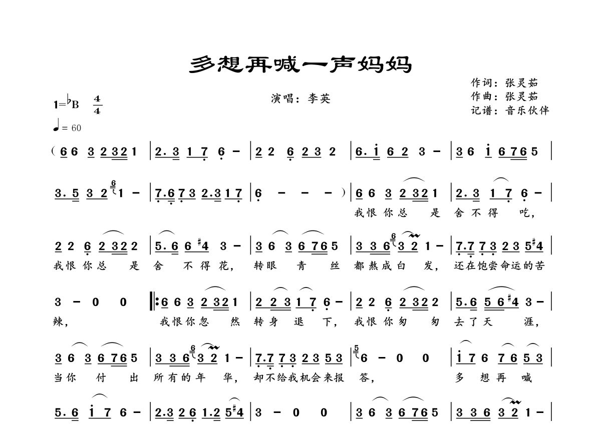 《多想再喊一声妈妈》是李英演唱的一首歌曲,拍号为4/4拍,歌曲速度为每分钟60拍,这份简谱共有一张高清图谱,图谱由 @音乐伙伴 编配上传。