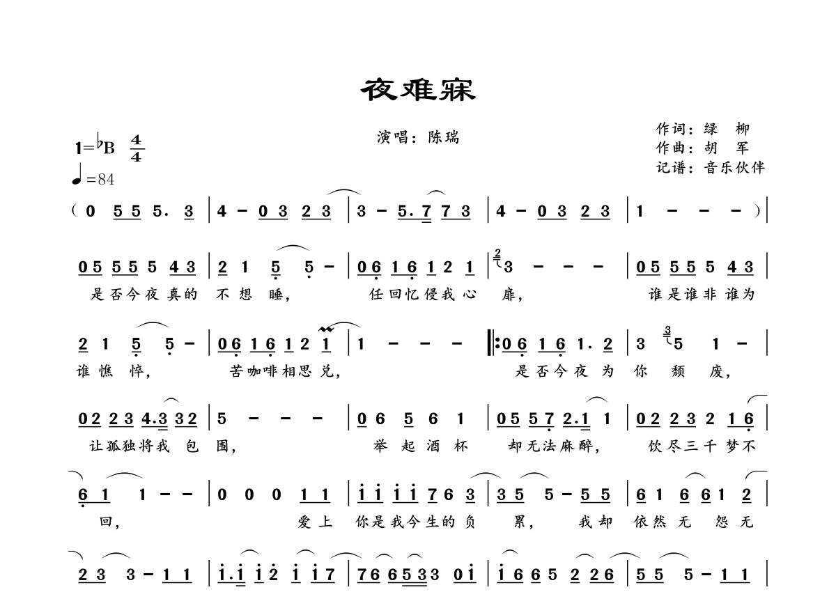 《夜难寐》是陈瑞演唱的一首歌曲,拍号为4/4拍,歌曲速度为每分钟84拍,这份简谱共有一张高清图谱,图谱由 @音乐伙伴 编配上传。