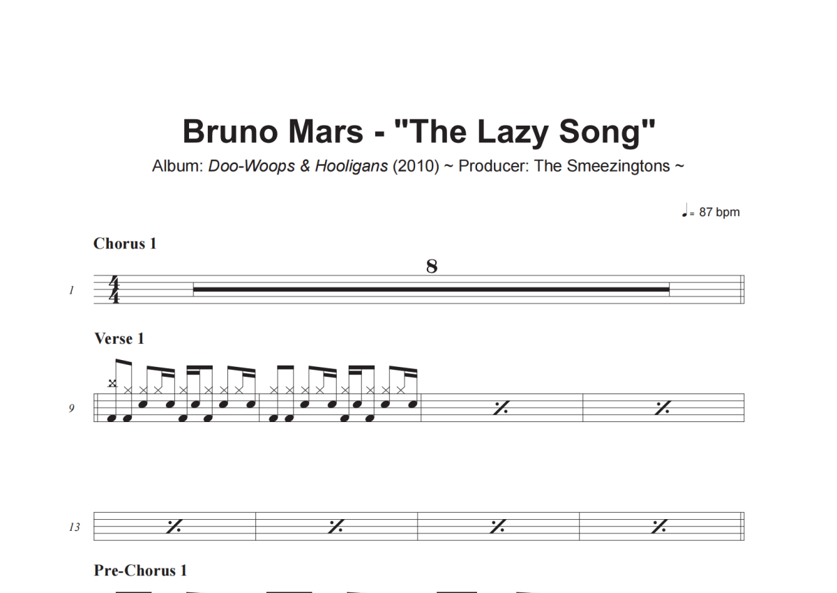 Bruno Mars《The Lazy Song》架子鼓谱