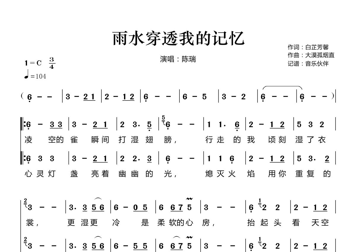 《雨水穿透我的记忆》是陈瑞演唱的一首歌曲,这份简谱共有两张高清图谱,图谱由 @音乐伙伴 编配上传。