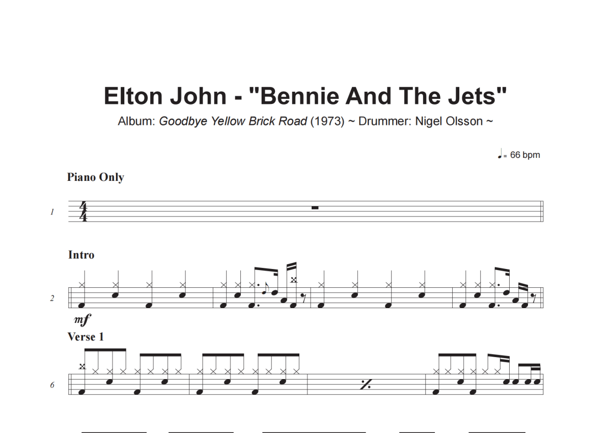 《Bennie And The Jets》是Elton John演唱的一首歌曲,这份架子鼓谱共有三张高清图谱,图谱由 @小虎鼓谱 编配上传,图谱使用五线谱编配,使用这份Bennie And The Jets架子鼓谱,你将能够轻松地敲打出这首Elton John的Bennie And The Jets,快来尝试吧。