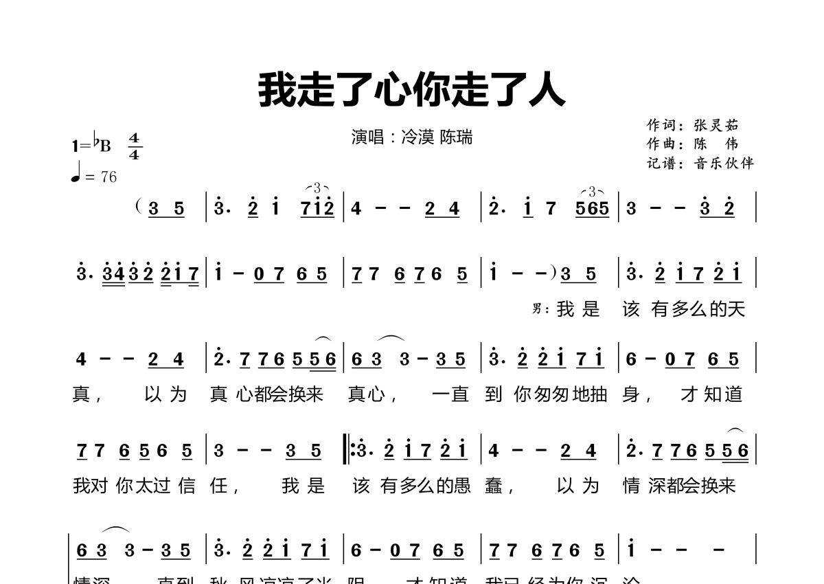 我走了心你走了人简谱 - 陈瑞 冷漠演唱