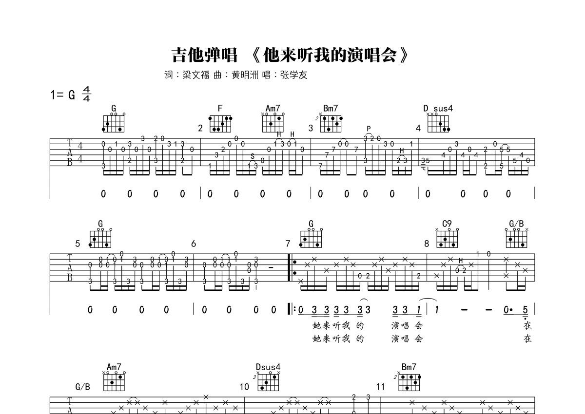张学友《她来听我的演唱会》吉他谱 - G调弹唱六线谱