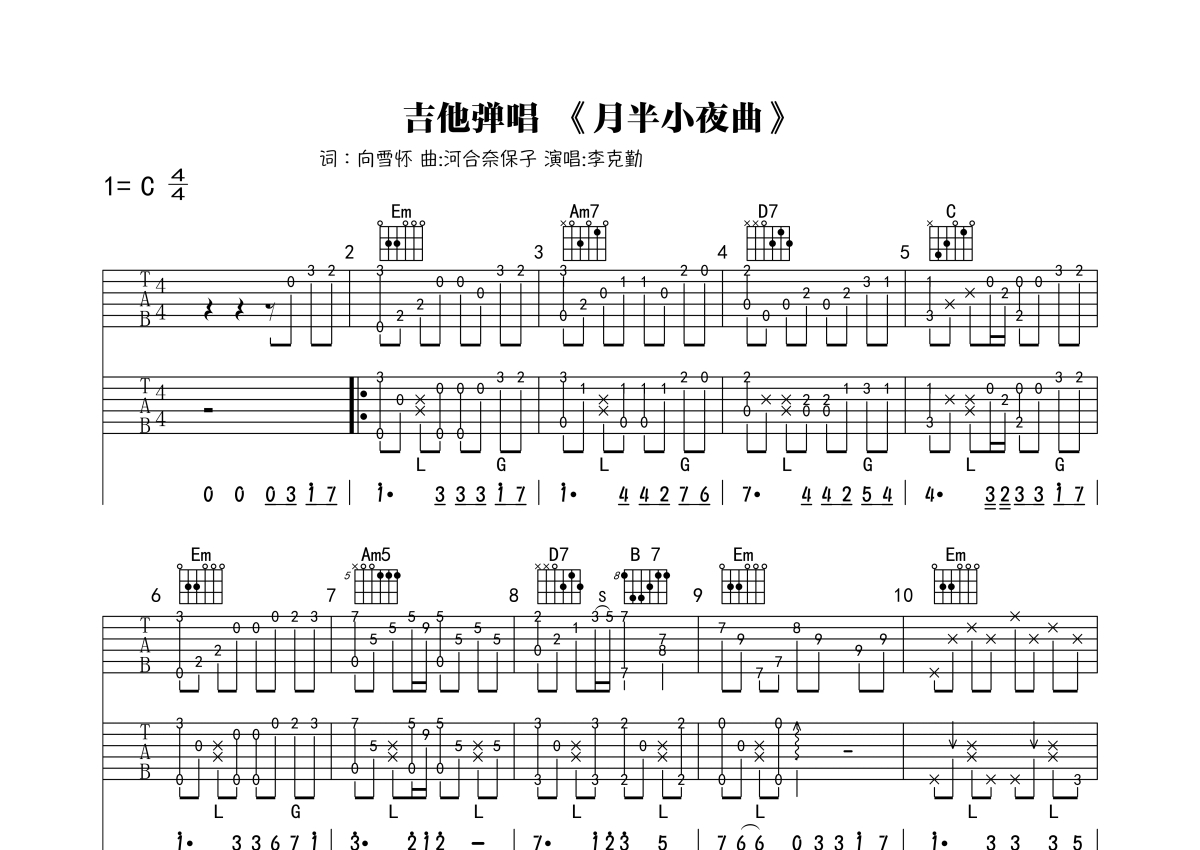 李克勤《月半小夜曲》吉他谱 - C调弹唱六线谱