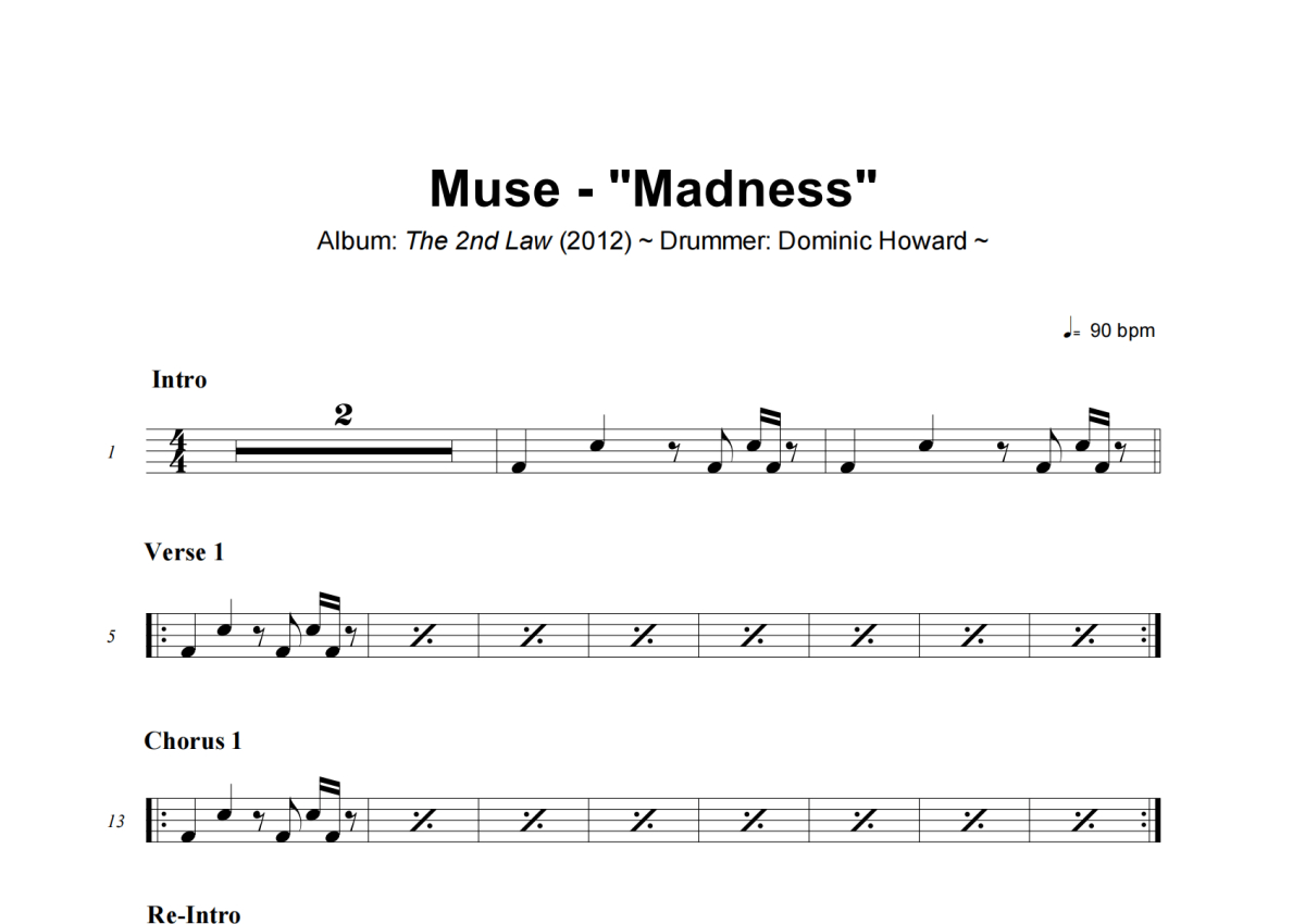 《Madness》是Muse演唱的一首歌曲,这份架子鼓谱共有三张高清图谱,图谱由 @小虎鼓谱 编配上传,图谱使用五线谱编配,使用这份Madness架子鼓谱,你将能够轻松地敲打出这首Muse的Madness,快来尝试吧。