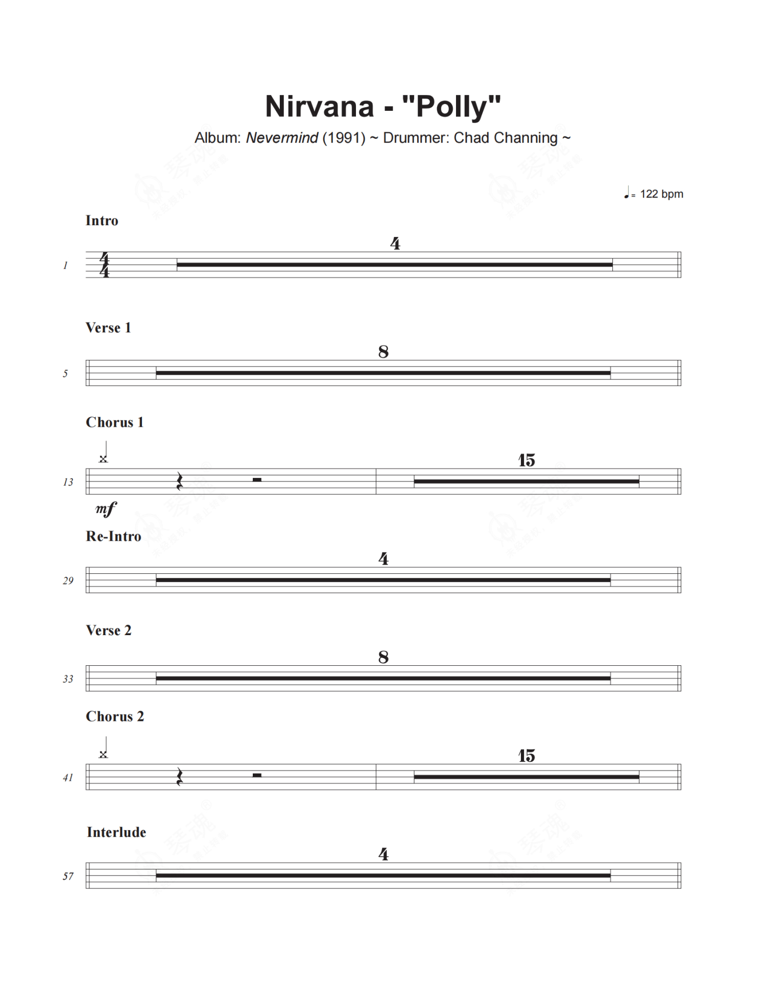 《Polly》是Nirvana演唱的一首歌曲,这份架子鼓谱共有两张高清图谱,图谱由 @小虎鼓谱 编配上传,图谱使用五线谱编配,使用这份Polly架子鼓谱,你将能够轻松地敲打出这首Nirvana的Polly,快来尝试吧。