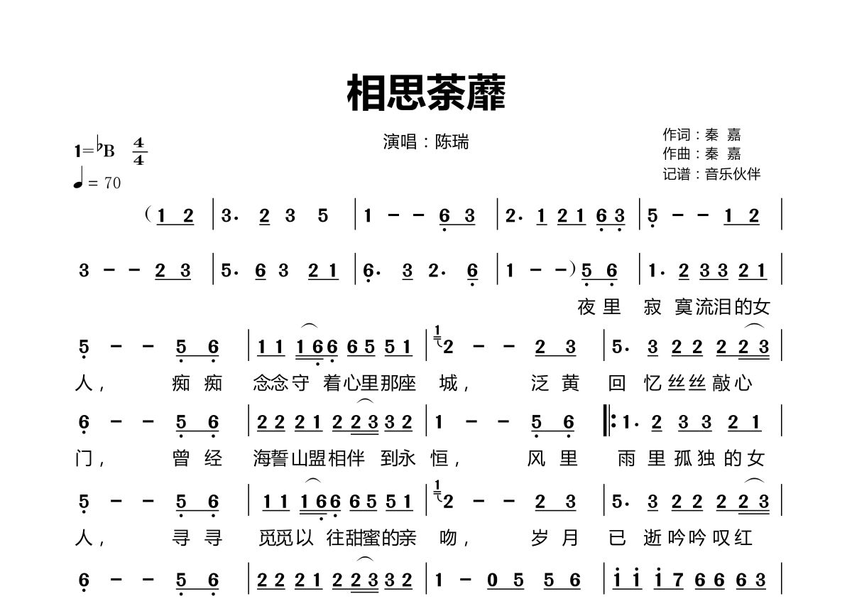 《相思荼蘼》是陈瑞演唱的一首歌曲,拍号为4/4拍,歌曲速度为每分钟70拍,这份简谱共有一张高清图谱,图谱由 @音乐伙伴 编配上传。