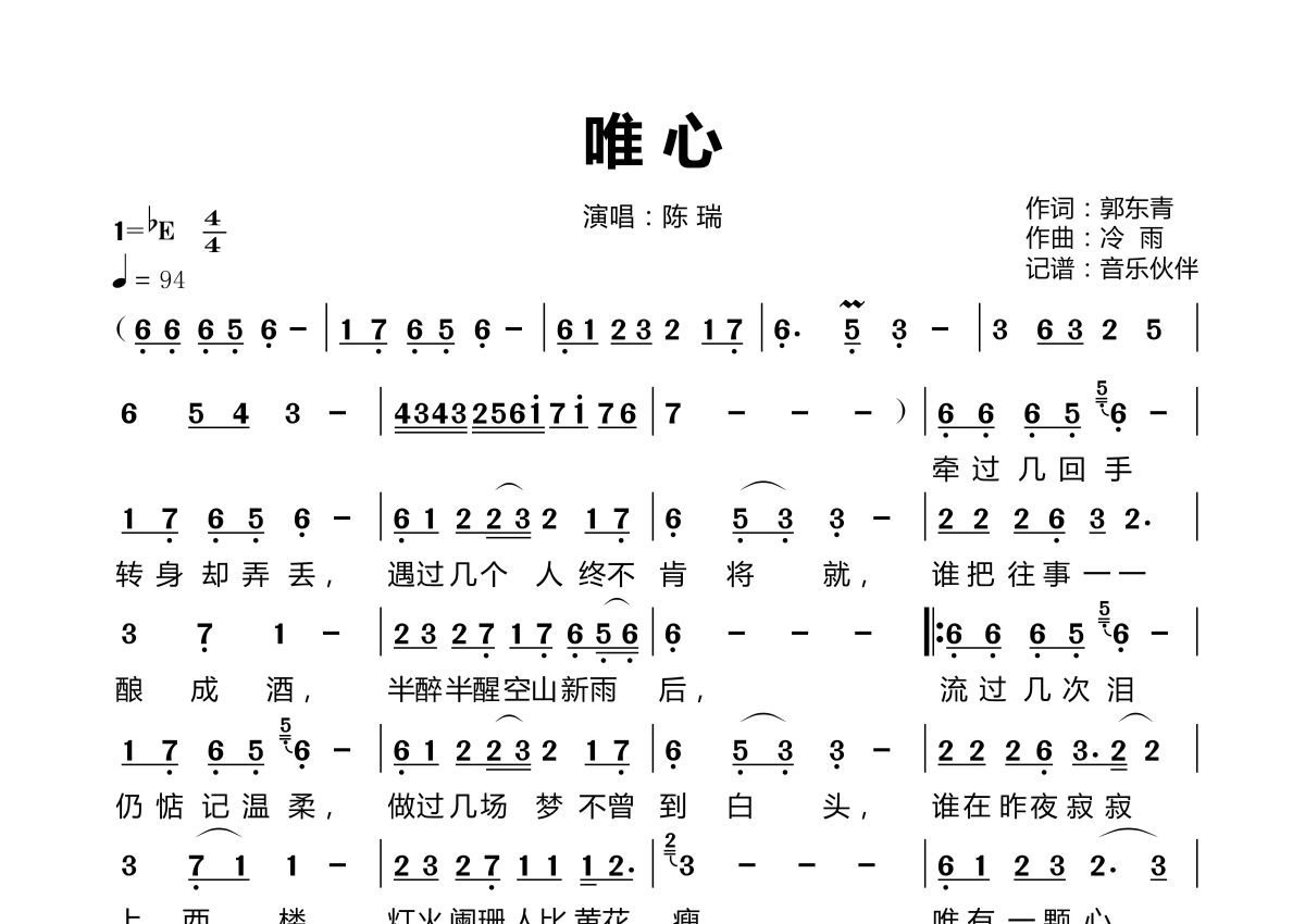 《唯心》是陈瑞演唱的一首歌曲,拍号为4/4拍,歌曲速度为每分钟94拍,这份简谱共有一张高清图谱,图谱由 @音乐伙伴 编配上传。