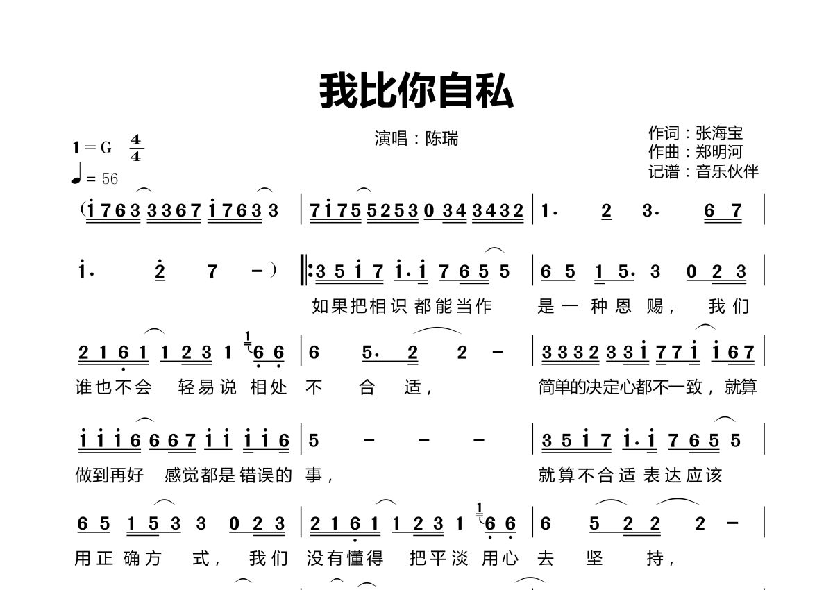 《我比你自私》是陈瑞演唱的一首歌曲,拍号为4/4拍,歌曲速度为每分钟56拍,这份简谱共有一张高清图谱,图谱由 @音乐伙伴 编配上传。