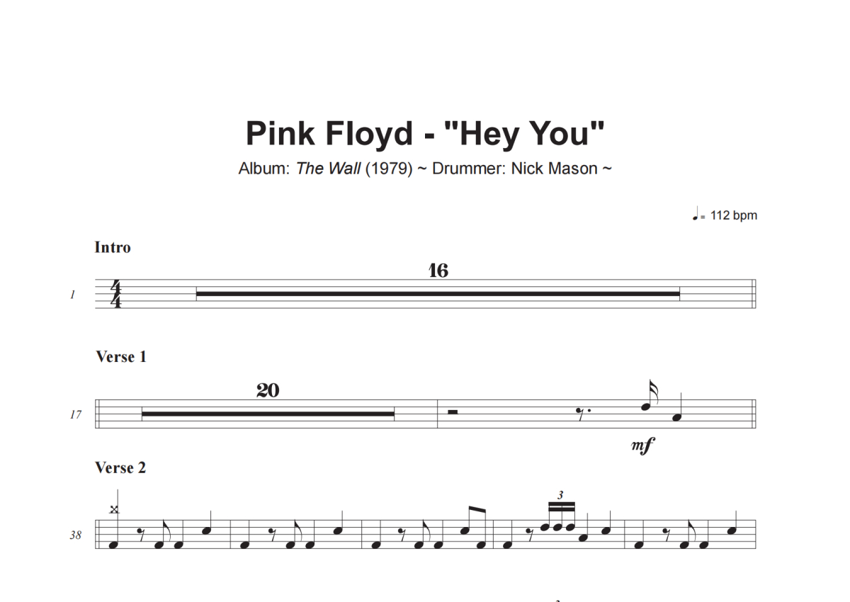 《Hey You》是Pink Floyd演唱的一首歌曲,这份架子鼓谱共有三张高清图谱,图谱由 @小虎鼓谱 编配上传,图谱使用五线谱编配,使用这份Hey You架子鼓谱,你将能够轻松地敲打出这首Pink Floyd的Hey You,快来尝试吧。