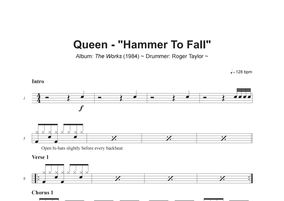 《Hammer To Fall》是Queen演唱的一首歌曲,这份架子鼓谱共有四张高清图谱,图谱由 @小虎鼓谱 编配上传,图谱使用五线谱编配,使用这份Hammer To Fall架子鼓谱,你将能够轻松地敲打出这首Queen的Hammer To Fall,快来尝试吧。
