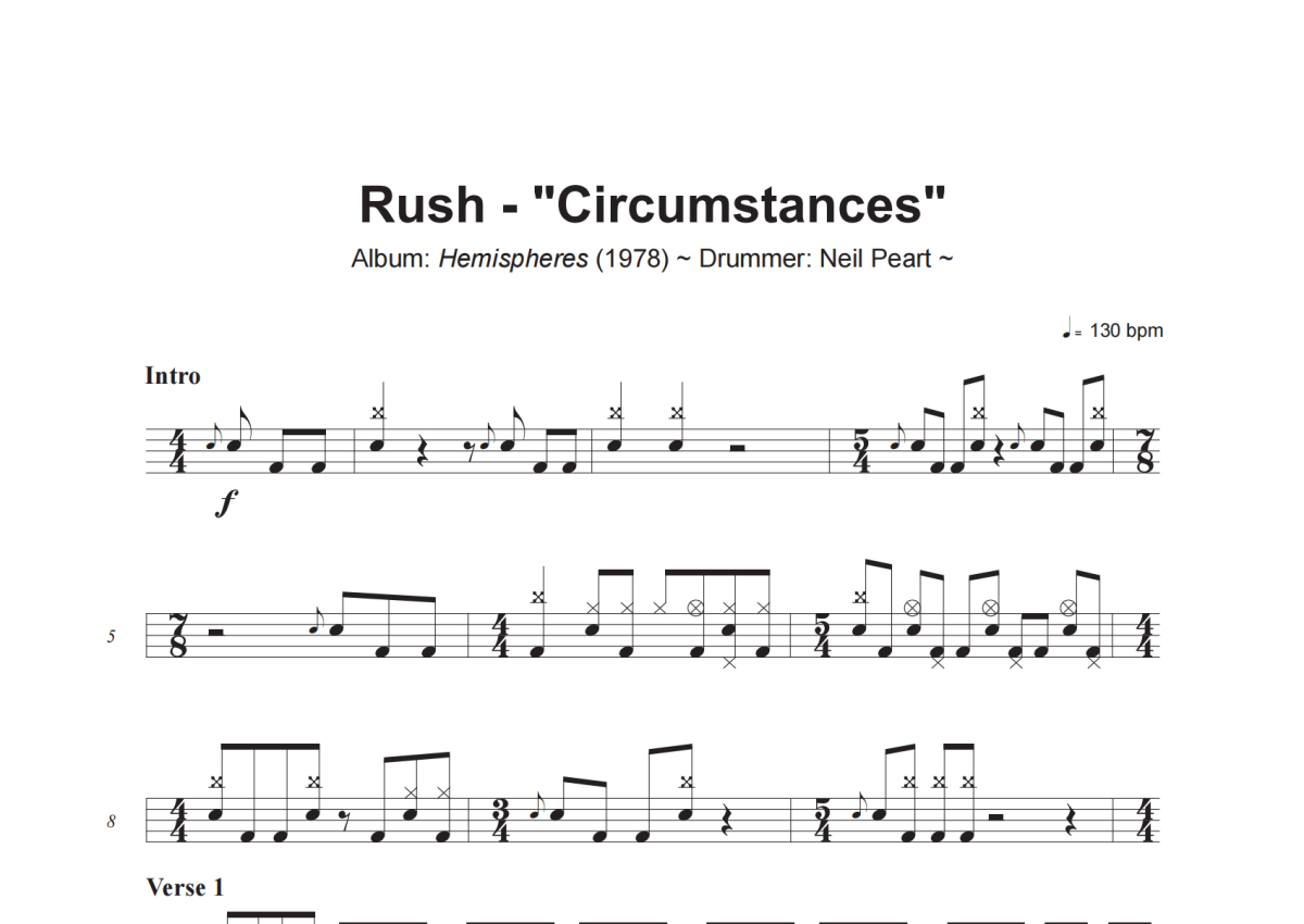 《Circumstances》是Rush演唱的一首歌曲,这份架子鼓谱共有四张高清图谱,图谱由 @小虎鼓谱 编配上传,图谱使用五线谱编配,使用这份Circumstances架子鼓谱,你将能够轻松地敲打出这首Rush的Circumstances,快来尝试吧。