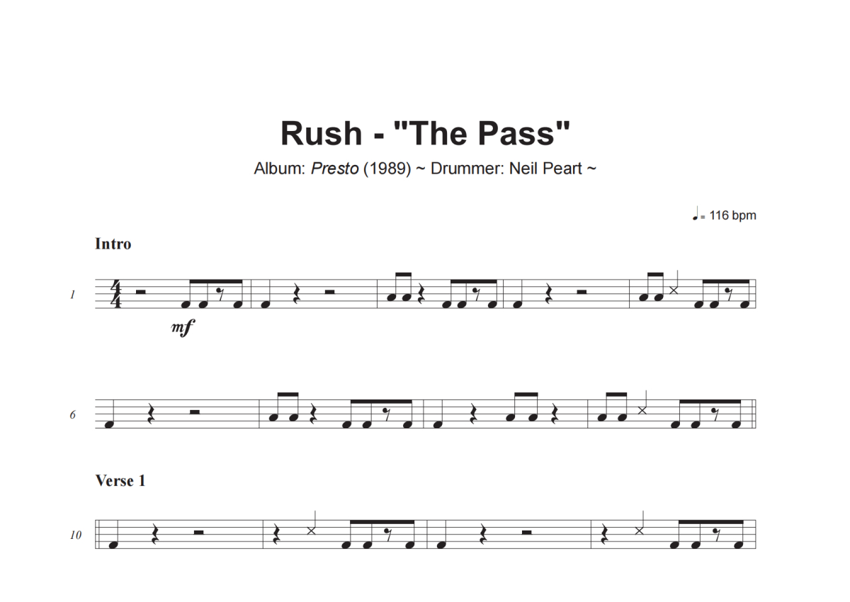 《The Pass》是Rush演唱的一首歌曲,这份架子鼓谱共有五张高清图谱,图谱由 @小虎鼓谱 编配上传,图谱使用五线谱编配,使用这份The Pass架子鼓谱,你将能够轻松地敲打出这首Rush的The Pass,快来尝试吧。