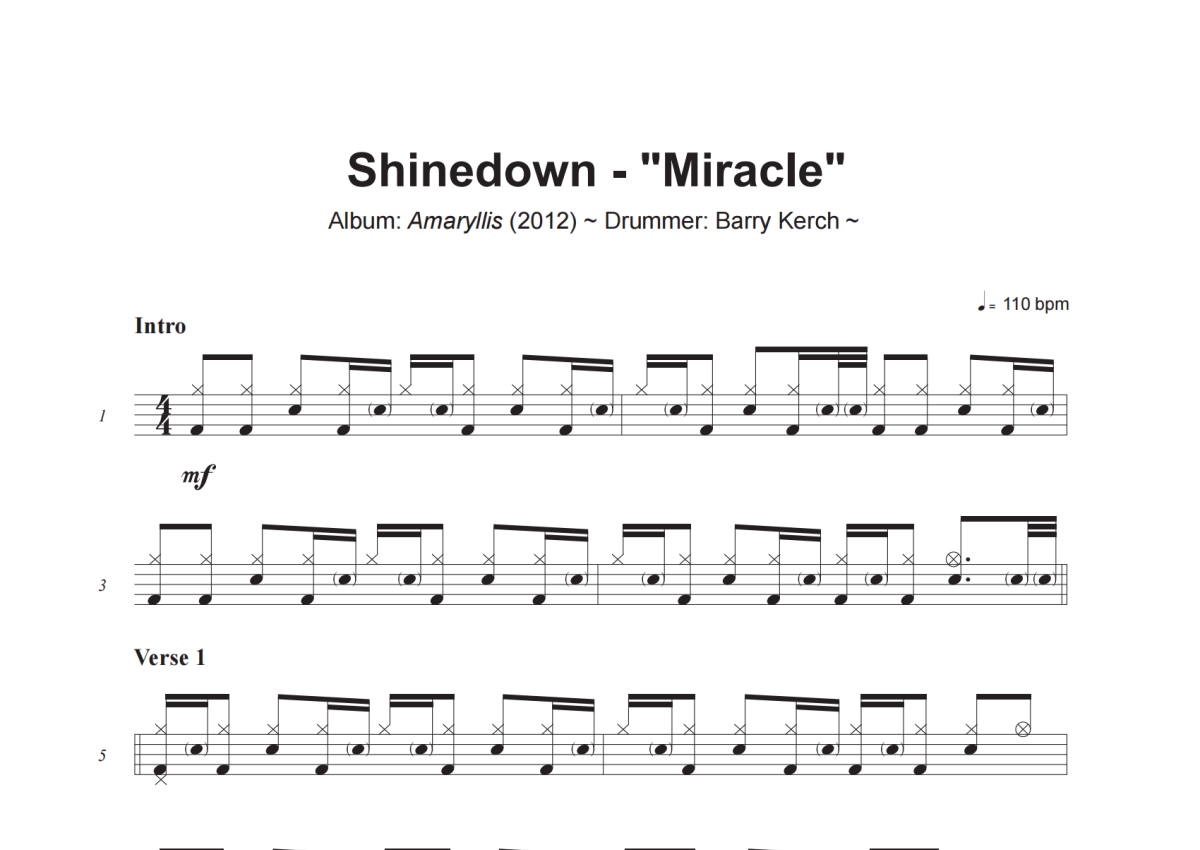 《Miracle》是Shinedown演唱的一首歌曲,这份架子鼓谱共有六张高清图谱,图谱由 @小虎鼓谱 编配上传,图谱使用五线谱编配,使用这份Miracle架子鼓谱,你将能够轻松地敲打出这首Shinedown的Miracle,快来尝试吧。