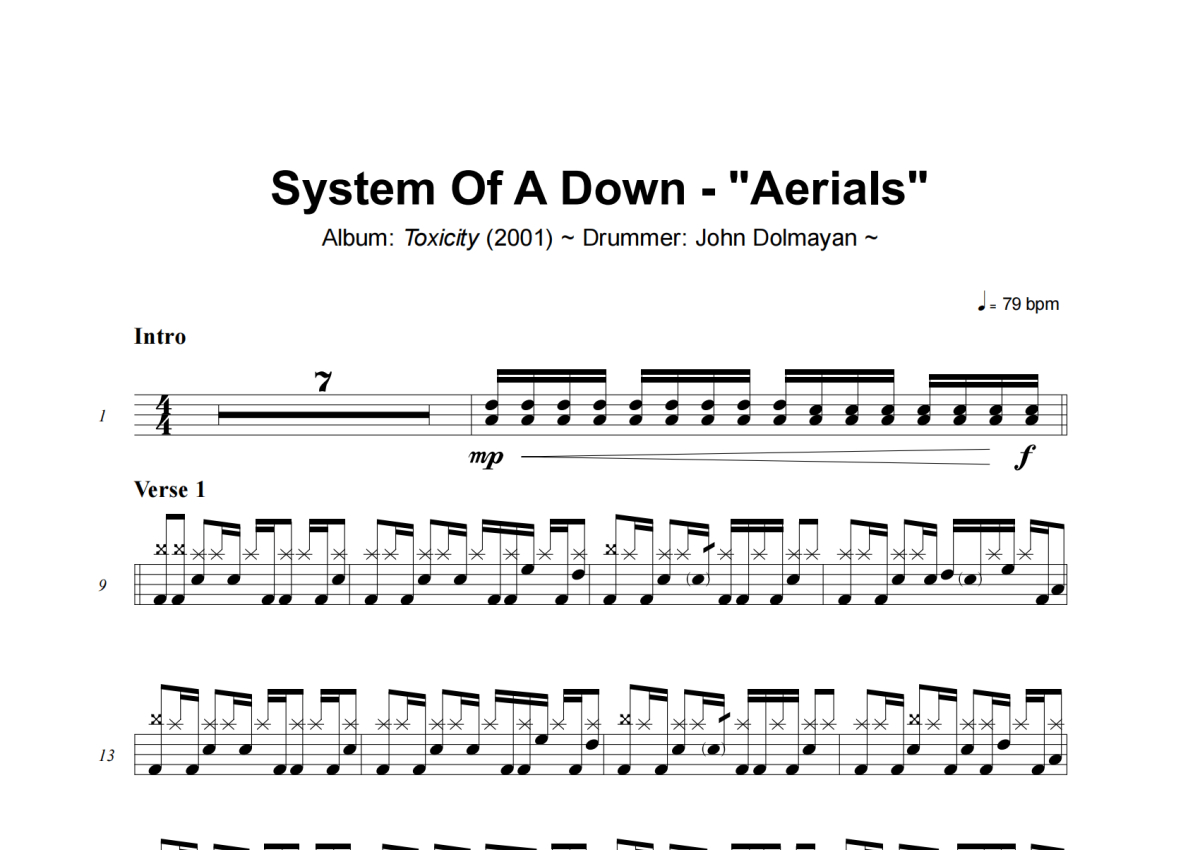 《Aerials》是System Of A Down演唱的一首歌曲,这份架子鼓谱共有三张高清图谱,图谱由 @小虎鼓谱 编配上传,图谱使用五线谱编配,使用这份Aerials架子鼓谱,你将能够轻松地敲打出这首System Of A Down的Aerials,快来尝试吧。