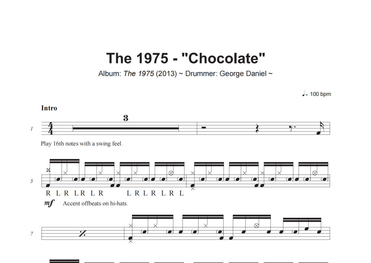 《Chocolate》是The 1975演唱的一首歌曲,这份架子鼓谱共有五张高清图谱,图谱由 @小虎鼓谱 编配上传,图谱使用五线谱编配,使用这份Chocolate架子鼓谱,你将能够轻松地敲打出这首The 1975的Chocolate,快来尝试吧。