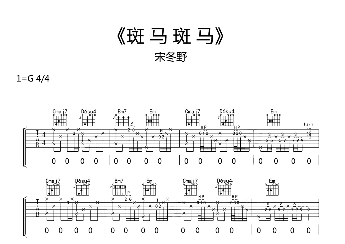 宋冬野《斑马斑马》吉他谱 - G调弹唱六线谱