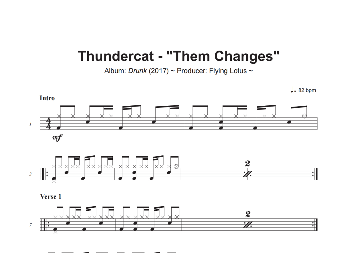 《Them Changes》是Thundercat演唱的一首歌曲,这份架子鼓谱共有两张高清图谱,图谱由 @小虎鼓谱 编配上传,图谱使用五线谱编配,使用这份Them Changes架子鼓谱,你将能够轻松地敲打出这首Thundercat的Them Changes,快来尝试吧。