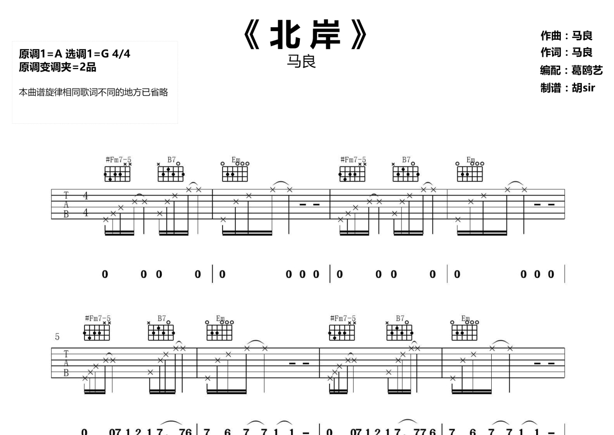 《北岸》是马良演唱的一首歌曲,本吉他谱采用的是G调指法编配,这份吉他谱共有三张高清图谱,图谱由 @胡sir音乐 编配上传,图谱使用六线谱编配,包含吉他和弦指法、简谱以及歌词部分,使用这份北岸吉他谱,可以让你更加方便地掌握这首歌曲的弹唱技巧,快来尝试吧。马良《北岸》吉他谱,原调A,变调夹夹二品,选用G调指法。歌曲讲述的是一个男人潜藏在内心深处情绪的变化。对于爱情的追求,无果而终,爱而不得的无力。整首歌曲的基调是黑色的,压抑的,冰冷的,但是最终在内心深处奔涌出压制不住的爱,完成了情绪的最终释放。悲伤的雨水一直下,浓重的阴霾遮住无边的天空,我一直梦见你。马良新单曲《北岸》,歌曲讲述的是一个男人对于爱情追求无果而终的无力,但是最终在内心深处奔涌出压制不住的爱,完成了情绪的最终释放。