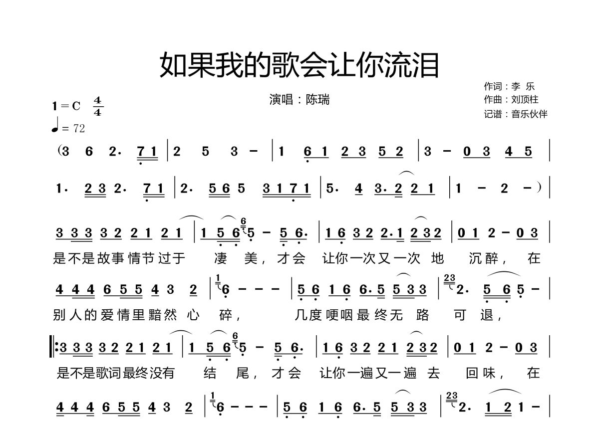 《如果我的歌会让你流泪》是陈瑞演唱的一首歌曲,拍号为4/4拍,歌曲速度为每分钟72拍,这份简谱共有一张高清图谱,图谱由 @音乐伙伴 编配上传。