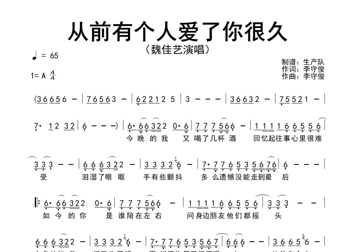 《从前有个人爱了你很久》是魏佳艺演唱的一首歌曲,原版简谱,拍号为4/4拍,歌曲速度为每分钟65拍,这份简谱共有一张高清图谱,图谱由 @生产队 编配上传魏佳艺演唱的歌曲《从前有个人爱了你很久》原版简谱,完整的前奏、间奏solo编配。