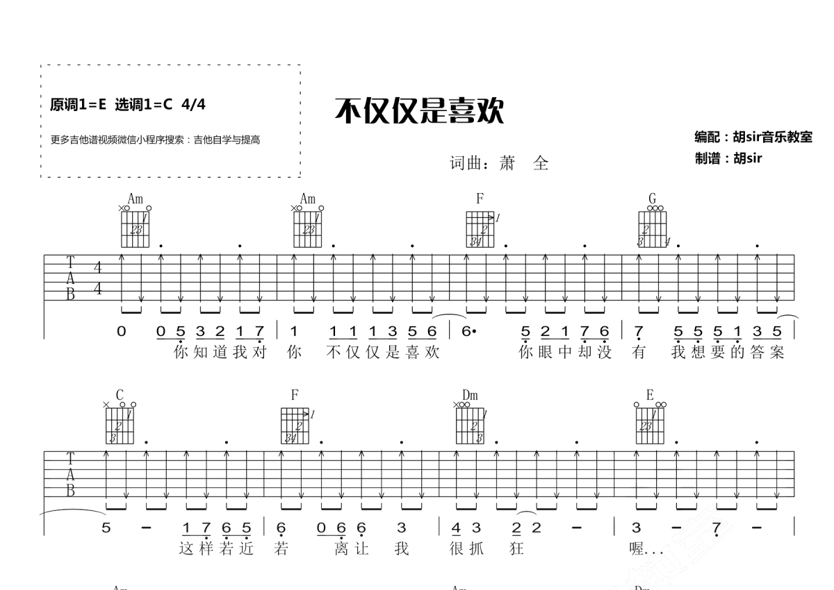 《不仅仅是喜欢》是萧全/孙语赛演唱的一首歌曲,本吉他谱采用的是C调指法编配,这份吉他谱共有两张高清图谱,图谱由 @胡sir音乐 编配上传,图谱使用六线谱编配,包含吉他和弦指法、简谱以及歌词部分,使用这份不仅仅是喜欢吉他谱,可以让你更加方便地掌握这首歌曲的弹唱技巧,快来尝试吧。不仅仅是喜欢吉他谱,萧全和孙语赛演唱的一首热门网络歌曲,不仅仅是喜欢六线谱,原调E,选调C。你知道我对你不仅仅是喜欢,你眼中却没有我想要的答案。这是抖音里一首很火的甜蜜情歌,女声一开口就把人吸引。喜欢的琴友们赶紧练习,吉他弹唱起来向心爱的TA表白吧。
