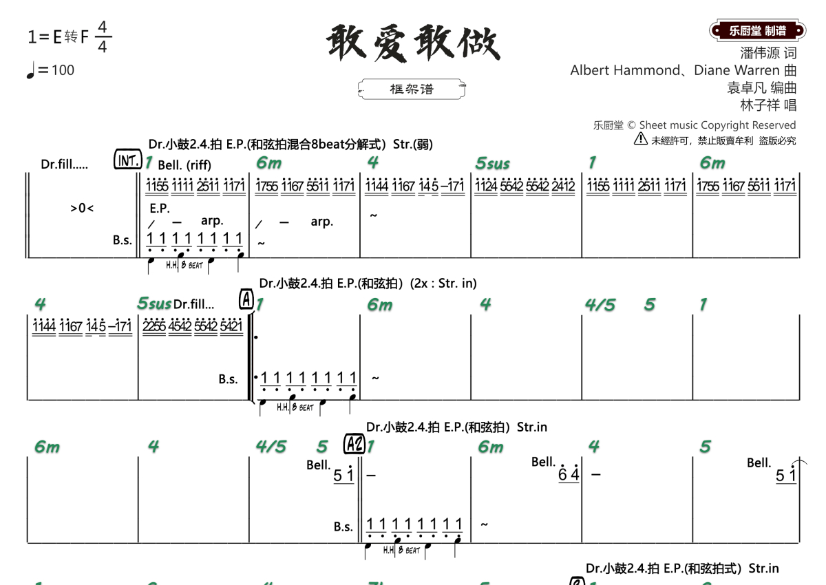 《敢爱敢做》是林子祥演唱的一首歌曲,框架谱,这份乐队总谱共有两张高清图谱,图谱由 @乐厨堂 编配上传。