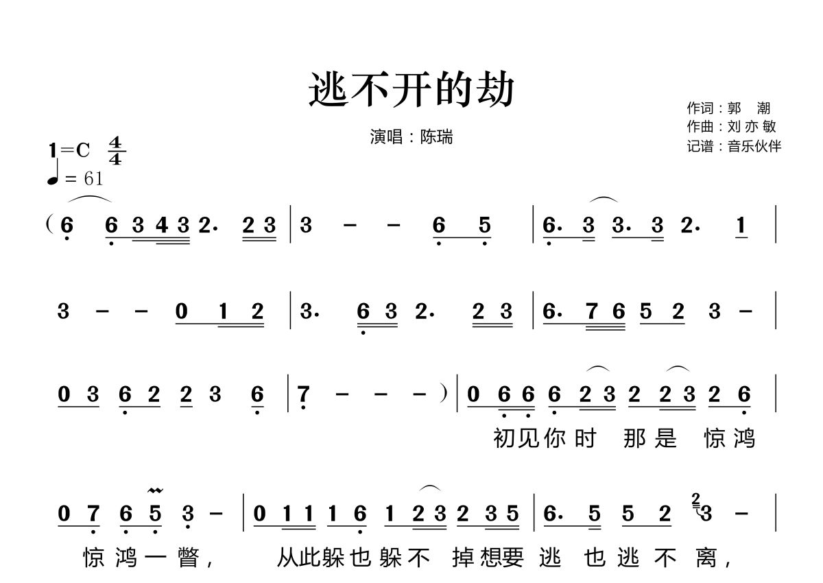 《逃不开的劫》是陈瑞演唱的一首歌曲,这份简谱共有两张高清图谱,图谱由 @音乐伙伴 编配上传。