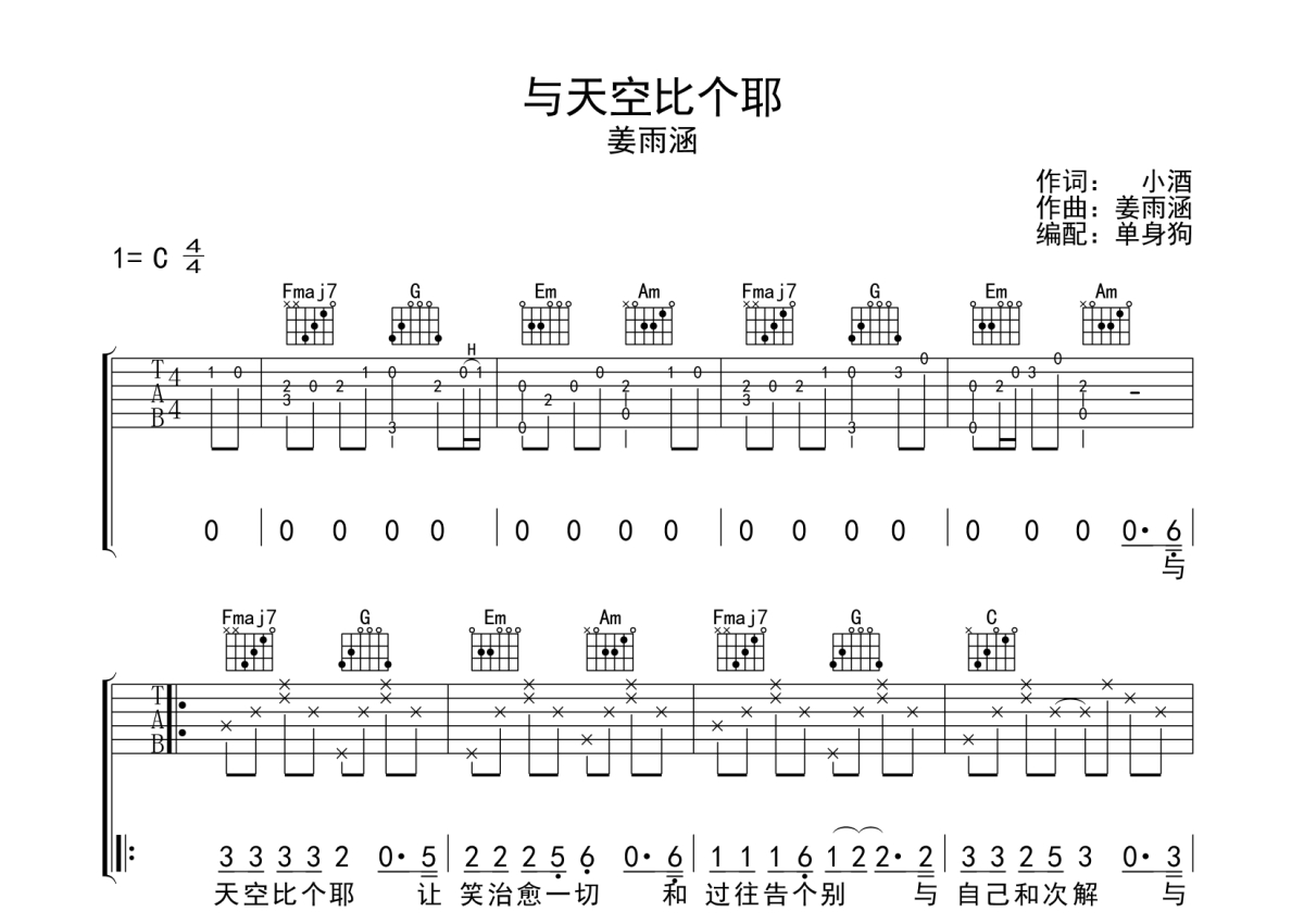 《与天空比个耶》是姜雨涵演唱的一首歌曲,拍号为4/4拍,歌曲原调为C调,本吉他谱采用的是C调指法编配,演奏时不需要使用变调夹即为原调,这份吉他谱共有两张高清图谱,图谱由 @单身狗 编配上传,图谱使用六线谱编配,包含吉他和弦指法、简谱以及歌词部分,使用这份与天空比个耶吉他谱,可以让你更加方便地掌握这首歌曲的弹唱技巧,快来尝试吧。