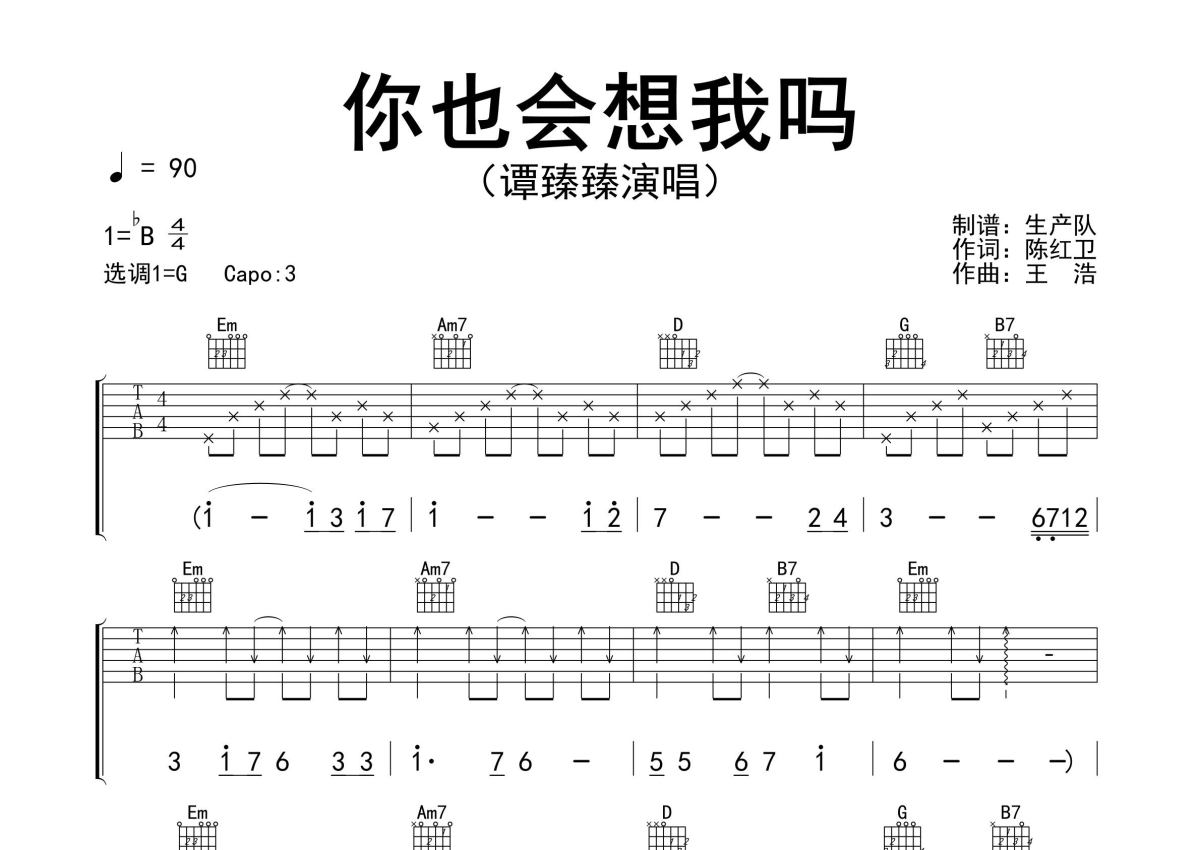 《你也会想我吗》是谭臻臻演唱的一首歌曲,精编完美版,拍号为4/4拍,歌曲速度为每分钟90拍,歌曲原调为Bb调,但由于原调指法比较难,为了方便弹奏,本吉他谱采用的是G调指法编配,变调夹3品弹奏即为原调,当然也可以根据自己的音域改变变调夹位置,或者通过改变和弦调性,以方便自己弹奏,这份吉他谱共有三张高清图谱,图谱由 @生产队 编配上传,图谱使用六线谱编配,包含吉他和弦指法、简谱以及歌词部分,使用这份你也会想我吗吉他谱,可以让你更加方便地掌握这首歌曲的弹唱技巧,快来尝试吧。谭臻臻演唱的歌曲《你也会想我吗》原版吉他谱,完整的前奏、间奏、尾奏solo编配,一首动听的抒情歌曲,值得推荐!。
