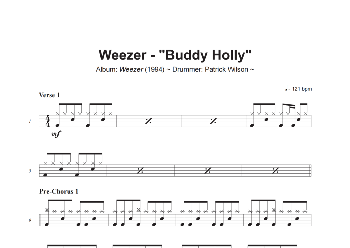 《Buddy Holly》是Weezer演唱的一首歌曲,这份架子鼓谱共有三张高清图谱,图谱由 @小虎鼓谱 编配上传,图谱使用五线谱编配,使用这份Buddy Holly架子鼓谱,你将能够轻松地敲打出这首Weezer的Buddy Holly,快来尝试吧。